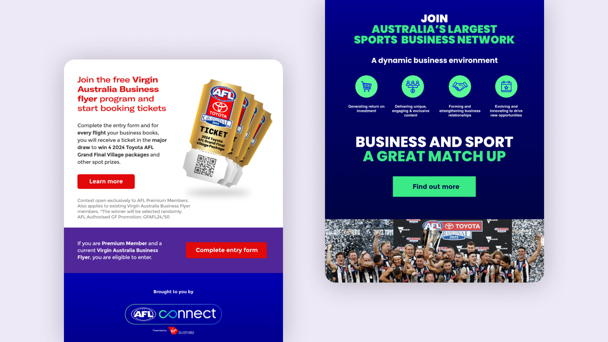 Since 2014 we have worked with AFL Membership. In recent years, that has extended to AFL Connect, the largest sports-based business networking group in Australia. As part of our deliverables, we work with the AFL Connect team on deliverables for their major sponsor, Virgin Australia.